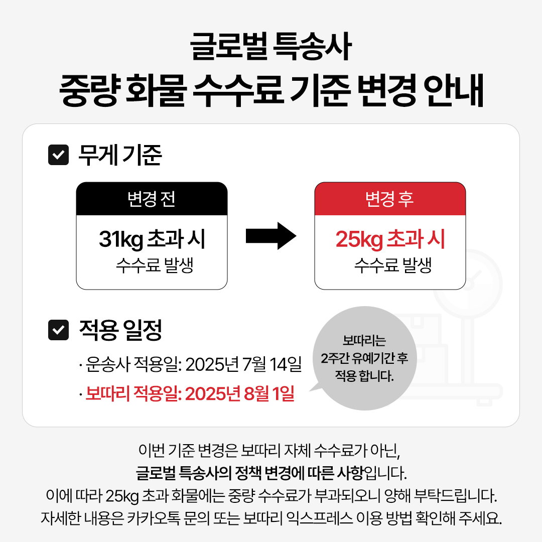 ※우편번호 기준 외곽지, 규격 외 물품, 25kg 초과 시에는 추가비용이 발생할 수 있습니다.